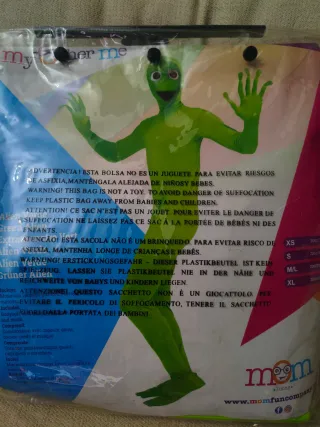 Disfraz de alienígena verde, inspirado en el popular meme Dame tu cosita. Incluye máscara. Usado sólo una vez. - Color: Verde brillante. - Talla: XL (según etiqueta). - Material: Poliéster.