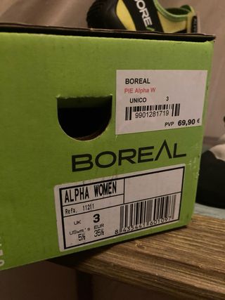 🧗♀️ Pies de gato Boreal Alpha Women + magnesio (REGALO) Pies de gato Boreal Alpha Women 📏 Talla EUR 35½ (UK 3) 🆕 Usados solo 2 veces, prácticamente nuevos 📦 Con caja original Incluyo bote de magnesio NUEVO de regalo, sin usar. Modelo cómodo y polivalente, ideal para iniciación y escalada indoor. Muy buen ajuste y suela en perfecto estado. 📌 PVP original: 69,90 € Estado: excelente