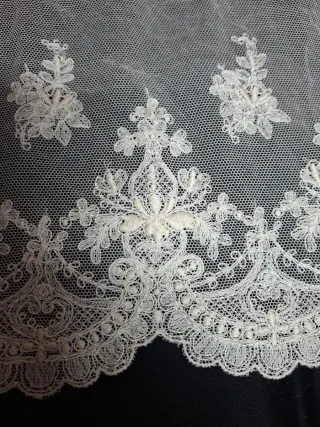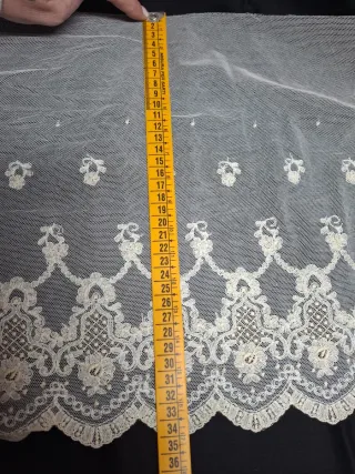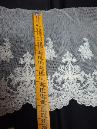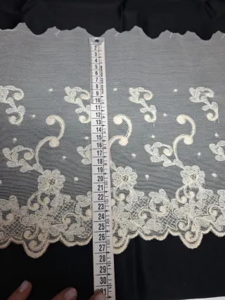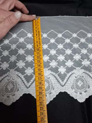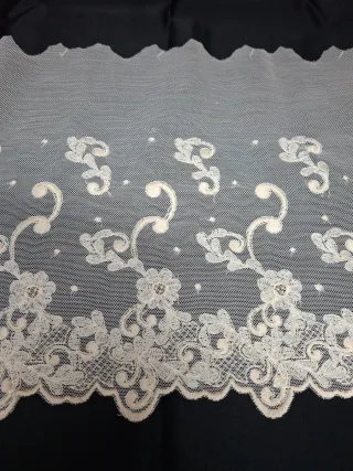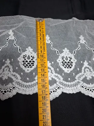 Preciosa puntilla de encaje en color blanco y crudo, ideal para añadir un toque elegante a tus creaciones. - Longitud: 2 metros. - Ancho: 20 cm. - Diseño delicado con motivos florales y detalles calados.