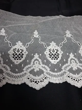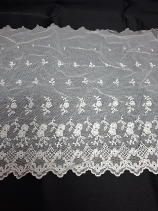Bonita puntilla de encaje en color blanco. Ideal para adornar prendas o manualidades. - Ancho: 24 cm. - Diseño floral con detalles. - Borde festoneado.