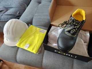 Equipo protección individual (EPI) para la construcción. Incluye un casco blanco nuevo y unos zapatos de seguridad Forli negros con detalles amarillos, también nuevos con caja. - Casco blanco, talla única. - Zapatos de seguridad Forli, talla 43. - REGALO: Chaleco reflectante amarillo.