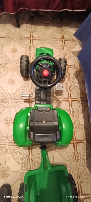 Vendo tractor para niños de entre 3 y 7 años con remolque. El tractor funciona y está en buen estado. Su precio es de 135 euros. Lo vendo por 40 euros. - Color verde. - Volante con botón. - Remolque. - Ruedas de plástico.