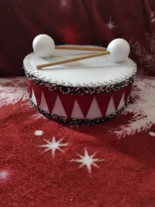 Tambor decorativo hecho a mano, ideal para adornos. - Diseño festivo con detalles brillantes. - Incluye dos baquetas.
