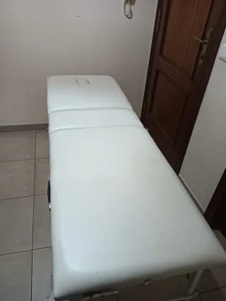 Camilla de estética en color blanco. Se encuentra en buen estado. - Tapicería de vinilo. - Orificio facial. - Estructura metálica.
