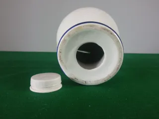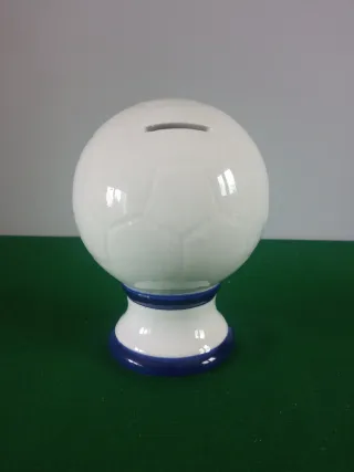 Hucha con forma de balón de fútbol, ideal para decorar o ahorrar. - Diseño de balón de fútbol. - Base blanca con detalles azules.