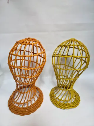 Dos soportes de exhibición para sombreros o pelucas, hechos de mimbre. - Diseño de cabeza. - Base ancha para estabilidad. - Color naranja. - Color amarillo. El precio es de cada unidad