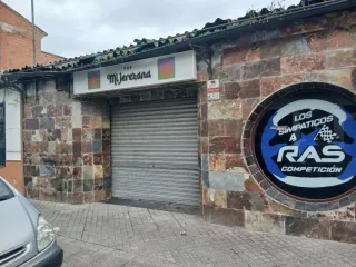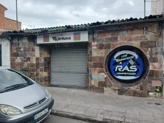 Pub Mi Jerezana con fachada de piedra y un gran rótulo circular. - Rótulo Los Simpáticos a RAS Competición. - Puerta de garaje metálica. Traspasoo de pab discoteca con licencia de conciertos y actuaciones en directo, en almodovar del rio.