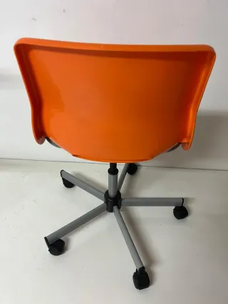Silla de oficina con un diseño moderno y funcional. - Asiento y respaldo de plástico naranja. - Base de cinco patas con ruedas. - Altura regulable.