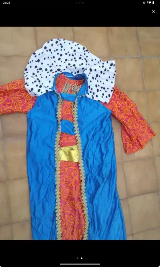 Disfraz de Rey Mago para niños. - Talla 7/9 años. - Incluye túnica y capa con cuello. - Diseño con detalles dorados y estampado azul.