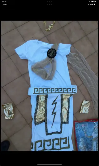 Disfraz de dios griego para niño o niña, talla 10/12 años. Perfecto para fiestas temáticas o Carnaval. - Incluye túnica blanca con detalles dorados. - Cinturón con greca dorada. - Brazaletes dorados. - Adorno para el hombro con rayo.