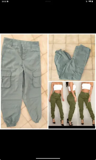 Pantalones cargo de color verde, talla M. Son cómodos y con un diseño moderno. - Cintura elástica. - Bolsillos laterales. - Bajo ajustado con elástico.