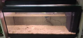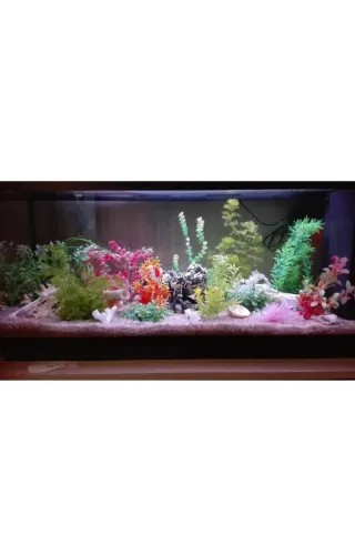Pecera de 90 litros con decoración. - Incluye plantas artificiales de varios colores. - Adornos como rocas y figuras decorativas. - Base de arena. - Medidas aproximadas: 80x30x40 cm.