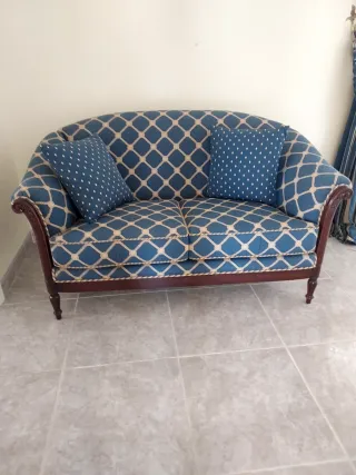 Elegante sofá de dos plazas con un diseño clásico y estampado de rombos en azul y beige. Incluye dos cojines decorativos a juego. MEDIDAS = 1"37 X 75 DE FONDO. - Tapicería con estampado de rombos. - Dos cojines decorativos. - Estructura de madera oscura.