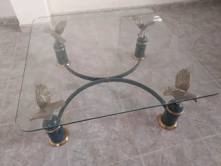 Elegante mesa de centro con tapa de cristal y base decorada con águilas. MEDIDAS : 1"5 cm X 1"5 cm x 44 d alta. " IMPECABLE " - Diseño único con águilas en bronce. - Base de mármol y metal. - Cristal templado resistente.