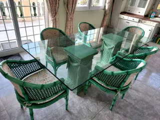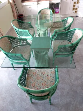 Elegante juego de comedor con mesa de cristal y seis sillas. MEDIDAS : 1'14 cm x 2"40 cm. - Mesa con superficie de cristal. - Seis sillas con estructura de bambú pintado en verde. - Tapicería floral en las sillas.