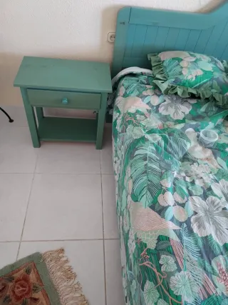 Cama con colchón y mesitas d noche a juego. TODO X 180 eur. MEDIDAS: 2 metros x 180 d ancha x 55 d alta, mesitas : 55 x 31 d fondo x 54 d alta. También ropa d la cama. Todo x 150 eur.