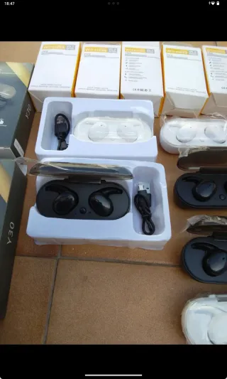 Conjunto de siete auriculares inalámbricos. En su caja y sin estrenar. - Diseño ergonómico. - Color negro y blanco.