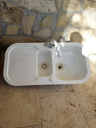 Fregadero doble de color blanco, ideal para cocinas o exteriores. Incluye grifo. Fregadero doble seno con grifo y conexiones 96 x 50, material pasta muy dura. - Dos cubetas. - Zona de escurridor. - Fabricado en material resistente.