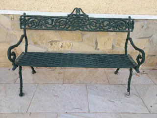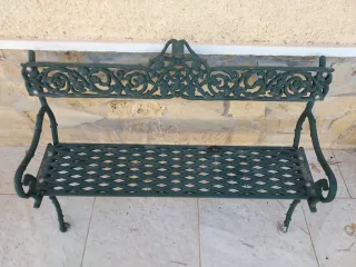 Banco de jardín de hierro forjado con un diseño ornamental. MEDIDAS : 60 cm x 1"20 cm - Color verde. - Asiento y respaldo con detalles calados. - Patas curvas y decorativas.