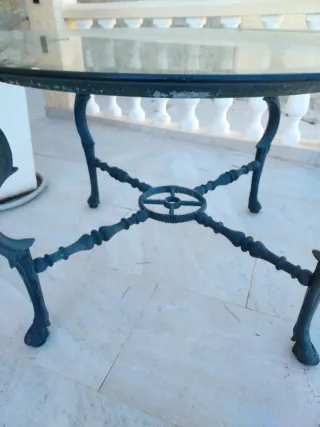 Mesa de exterior con sobre de cristal y base de metal forjado. " MEDIDAS : 1" 10 cm d radio " - Diseño elegante con patas ornamentadas. - Ideal para terrazas y jardines.