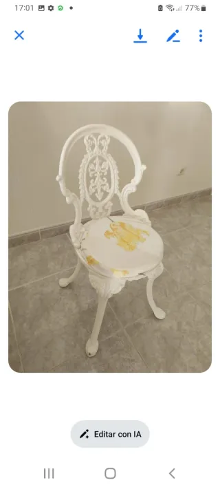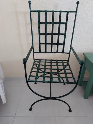 Elegante silla de forja con un acabado en verde desgastado que le da un toque vintage. Su diseño de rejilla tanto en el asiento como en el respaldo la hace destacar. 2 Sillas d hierro , 50 x 50 ,asiento a 45 cm del suelo, 40 eur cada una. - Material: Forja - Color: Verde - Diseño: Rejilla