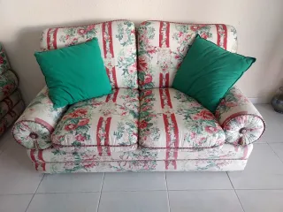 Sofá de dos plazas con un bonito estampado floral y rayas verticales rojas. Incluye dos cojines decorativos en color verde. " Sofá d 2 plazas con cojines verdes y 2 d 1 plaza " . - Diseño clásico y acogedor. - Tapicería con motivos florales. - Dos cojines cuadrados de terciopelo.