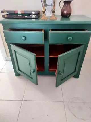 Mueble de madera pintado en color verde, con un acabado rústico. Mueble provenzal verde medidas : 98 x 44 x 75 d alto - Dos puertas con tiradores redondos. - Dos cajones superiores con tiradores redondos. - Diseño de estilo rústico.