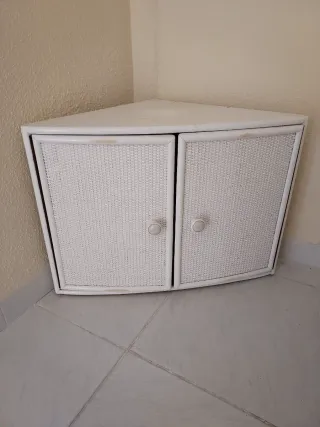 Mueble d esquina blanco con puertas de mimbre, MEDIDAS : 48 d alto x 66 d ancho. - Diseño triangular para esquinas. - Dos puertas con tiradores redondos. - Acabado en mimbre tejido.