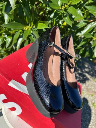 Zapatos de plataforma de la marca Wonders en color negro. - Diseño con tira al tobillo. - Acabado brillante con textura. - Plataforma gruesa.