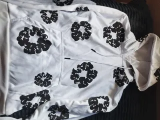Sudadera con capucha de color blanco y un llamativo estampado de círculos negros. - Diseño moderno y original. - Tejido cómodo y suave. - Bolsillo frontal tipo canguro. Talla M usado una vez