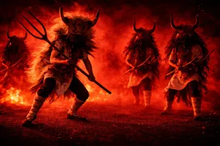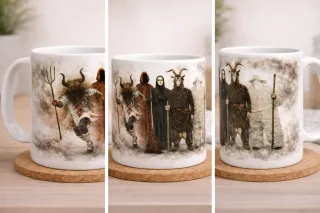 Conjunto de tazas de cerámica con un diseño único y llamativo. - Material: Cerámica. - Diseño: Ilustraciones de figuras mitológicas y festivas. - Acabado: Brillante.