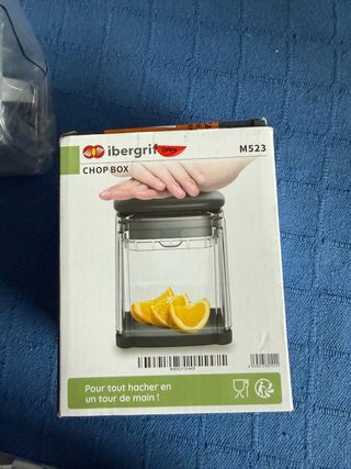 Caja picadora Ibergrif modelo M523. - Diseño transparente. - Incluye tres gajos de naranja en la imagen promocional. - Texto en francés: Pour tout hacher en un tour de main!