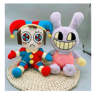 Set de dos peluches, uno con diseño de payaso y otro de conejo morado. - Peluche de payaso con traje de rombos rojos y azules. - Peluche de conejo morado con overol rosa y guantes amarillos. PRODUCTO NUEVO A ESTRENAR