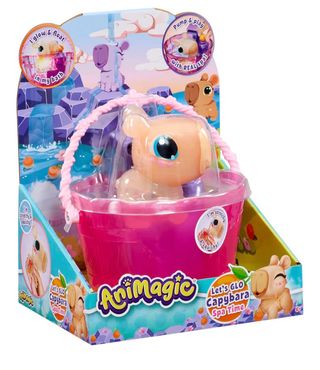 Juguete Animagic Capybara Spa Time para jugar en la bañera. Incluye accesorios para un spa. - Brilla y flota en el agua. - Se puede bombear y jugar con él. - Es elástico y blandito.