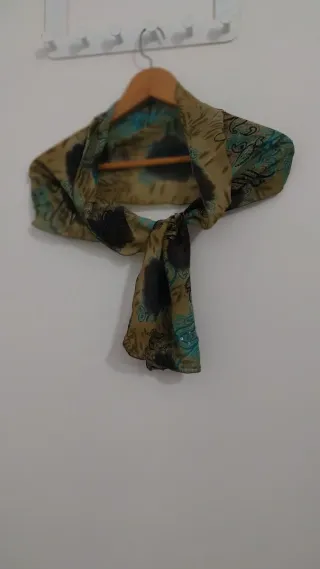 Pañuelo con un diseño llamativo y colores vibrantes. - Tejido ligero y suave. - Estampado con motivos florales y paisley en tonos verdes, azules y negros. - Detalle de lentejuelas en una de las puntas.