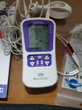 Estimulador de suelo pélvico NeuroTrac Pelvitone. - Incluye manual de instrucciones. - Dispositivo con pantalla digital. - Viene con electrodos y cables de conexión. - Incluye bolsa de transporte. está como nuevo