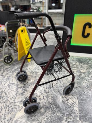 Andador para personas mayores con asiento y cesta. - Estructura de color burdeos. - Ruedas delanteras giratorias. - Frenos en las empuñaduras. - Cesta de tela negra. - Asiento acolchado. Nou de trinca, no ens passa per la porta de la cuina.