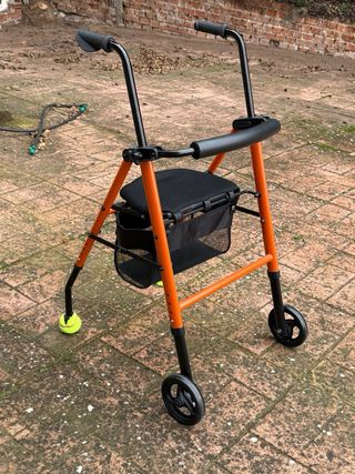 Andador con cesta portaobjetos, asiento y respaldo. Se puede utilizar con 2 o 4 ruedas. Sin estrenar, comprado en febrero (tengo factura). 50 cm de ancho, para pasar puertas estrechas.