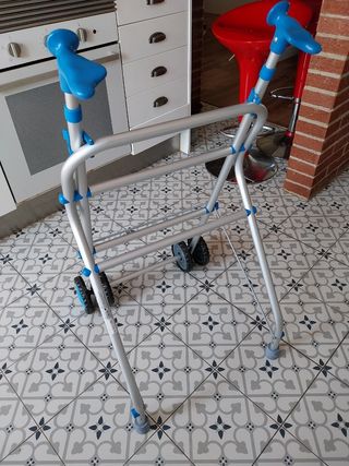 andador plegable para ancianos, ajustable en altura con ruedas y patas fijas detras. En buen estado