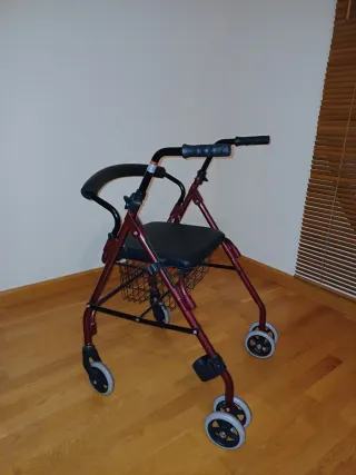 Andador de cuatro ruedas con asiento y cesta portaobjetos. Está en muy buen estado. Solo se ha usado 1 vez. - Estructura de metal resistente. - Asiento cómodo. - Cesta de tela negra. - Manillar regulable en altura. - Ruedas de goma. - Freno al sentarse.