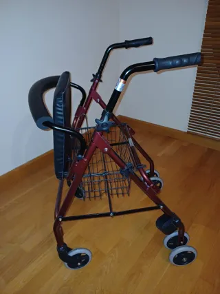 Andador para adultos, dispone de cesta para transportar objetos y asiento con respaldo . Se pliega facilmente. Color granate.