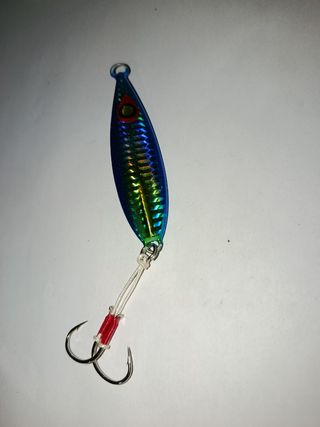 Señuelo de pesca metálico de 80g. Es de color azul con reflejos dorados. Incluye dos anzuelos. Ideal para la pesca deportiva. - Señuelo de metal. - 80 gramos de peso. - Color azul con brillos. - Dos anzuelos incluidos.