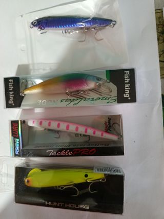 Se venden cuatro señuelos de pesca. Son de diferentes marcas y colores. - Incluyen un señuelo azul brillante, uno multicolor, uno rosa y blanco con lunares, y uno amarillo. - Están en sus cajas originales. - Perfectos para la pesca deportiva.