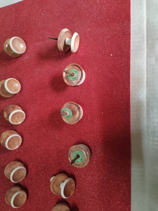 Juego de 19tiradores de baquelita de los años 70. Maciso garantizados resistentes irrompibles Marca rubí Están muy bien conservados procedente carpintería se usaban en muebles de cosina aparadores etc... Tornillo pasante apriete a rosca. Medidas. 6.5*4,enbellecedor plafon diámetro 5 cm. - Material: Baquelita - Época: Años 70 - Cantidad: 19unidades - Color: Marrón y beige