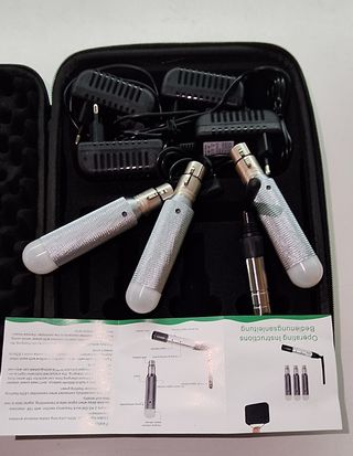 Tijeras eléctricas Anova en su maletín. - Incluye dos baterías y su cargador. - Maletín de transporte azul. - Bolsa negra para herramientas.