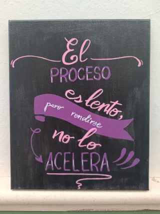 Cuadro decorativo con frase motivacional pintada a mano. - Técnica: Pintura acrílica. - Frase: El proceso es lento, pero rendirse no lo acelera. - Colores: Morado, rosa y negro. - Medidas 25x30 Hago, por encargo, cualquier frase que me pidas, y en cualquier medida de lienzo