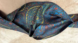 Pañuelo azul con estampado paisley en tonos azules, amarillos y rojos. - Diseño llamativo y colorido. - Tejido suave al tacto.