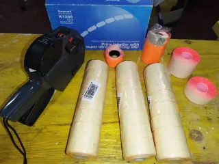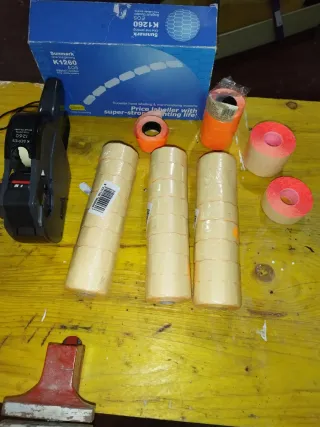 Se vende etiquetadora Sunmark K1260, ideal para negocios y comercios. Incluye varios rollos de etiquetas. - Modelo: Sunmark K1260 EOS. - Incluye 3 rollos de etiquetas color crema y 2 rollos de etiquetas color naranja. - Incluye 1 rollo de etiquetas color rosa.