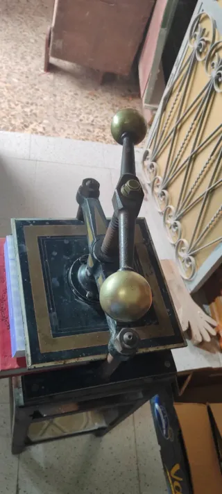 Prensa muy antigua procedente de una tienda de encuadernación, todo en perfecto estado de funcionamiento. Medidas base 35*35, altura 40, tornillos de aprietes terminados en bola de metal. Con una apertura máxima de 9 cm y un peso de casi 30 kg. Sin mueble!