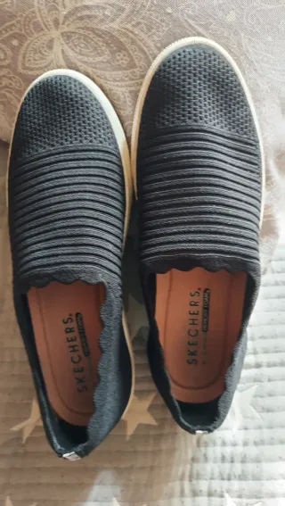 Zapatillas skechers Talla 39.5 que equivale a 40 sin cordones negras 39.5 como.un 40 Solo aranda de duero no envios ni empresas de trasporte Solo venta presencial Aranda. No tengo monedero No regsteo muchas gracias - Diseño moderno y llamativo. - Suela de goma negra.